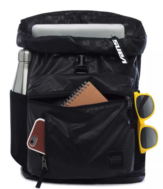 Tzv. roll top otevírání batohu se dnes těší čím dál větší oblibě a Vans rozhodně nezůstává pozadu. Jak to funguje? Horní část se jednoduše zaroluje a zapne sponou. Vnitřní prostor vám poskytne objem 21 l a vyztuženou přihrádku na notebook. Vně pak přední, boční i zadní kapsy, které pojmou a zorganizují všechny vaše nutnosti. Záda jsou vypolstovaná a dokonce jsou k dispozici hrudní popruhy, které zajistí maximální komfort při přenášení těžšího nákladu.